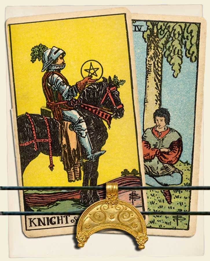 When it comes to love and relationships, the combination of Knight of pentacles and Four of cups is not seen as a favorable sign. This tarot combination suggests that two forces – efficiency and reevaluation – are affecting you right now. In practical terms, this often means that money is on its way, but how you handle it is up to you.