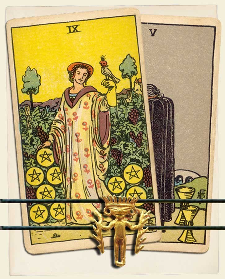 Nine of pentacles and Five of cups tarot combination means that mystic tarot forces: 1) Material Security and 2) Failure are jointly affecting you today. To put it differently, it means that you should consider if you have been stingier than you need to be. This could be the reason for your recent downfalls. Don’t be cheap to tip your waitress or hairdresser. The more we give, the more we receive. Although it is great practice to save your dollars in case you need them for yourself, don’t overdo it. You will gain a lot of pleasure from giving to those who are in need.