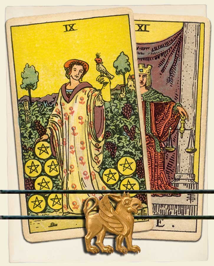 Nine of pentacles and Justice combination indicates that two arcane forces: (I) ABUNDANCE and (II) ACCOUNTABILITY are influencing you at this moment. What this pair signifies is that you are currently basking in the abundant pleasures your material success has afforded you. You deserve to drink the nectar of your fruits. There is, however, a disagreement brewing with an acquaintance or family member that needs to be resolved. This conflict might arise as a result of your achievements. It’s a situation which requires wisdom and rational thought. Find logical solutions to the problem so you can move forward peacefully.