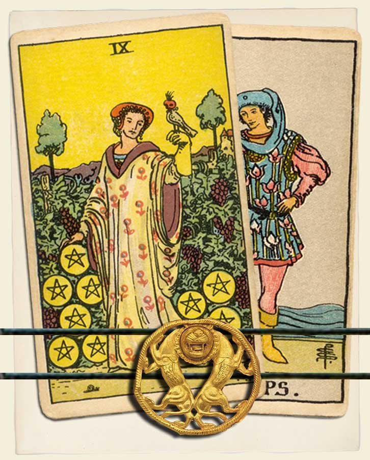 The Nine of Pentacles represents reaping what you have sowed and achieving your goals. When paired with the intuitive Page of Cups, it reminds us to trust our intuition in matters of love and relationships. It is important to listen to our inner voice when it comes to matters of the heart.