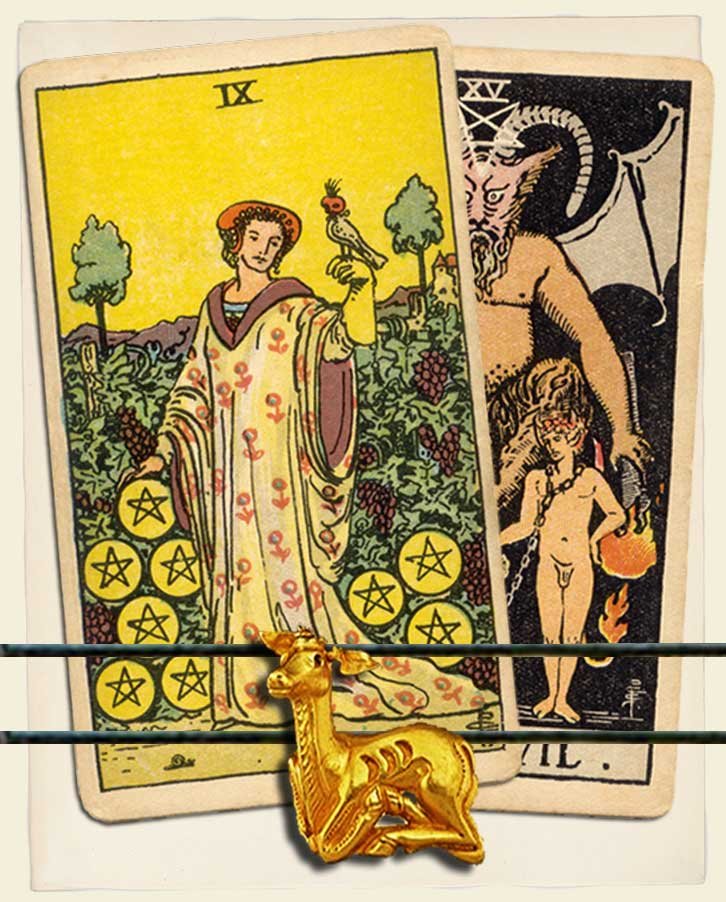 Nine of pentacles clarified by The Devil gives a glimpse into your current state and immediate future, which will come about from the influences of (1) Achievement (effect of Nine of pentacles) and (2) Obsession (effect of The Devil). You have faced it all. There were nights that you thought you would never make it to this point, but here you are. You‘re resilient, and you are in control, because you are just that good at what you do and everybody knows it—except you. When the Nine of Pentacles meets the Devil, you have finally made it only to find that you are still a prisoner to your own self-doubts and fears. Give yourself a break and try to see yourself the way that others do.