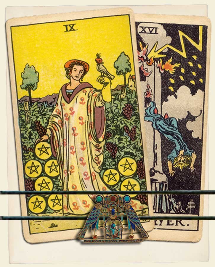 Well, it seems we’ve got a bit of a mixed bag here with the Nine of Pentacles and The Tower showing up together in regards to love and relationships. Let’s break it down.