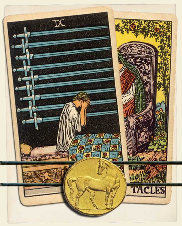 Nine of swords and Queen of pentacles combination gives a glimpse into a significant event in your future, which is influenced by the arcane forces of DESPAIR and NURTURING. The message from the tarot is not to rush through your grief. Experienced counselors will tell you that grieving is a process. A wound must be nurtured in order to heal properly. If there is someone you can look to for comfort, you would be wise not to let yourself suffer in solitude and silence. A motherly figure in your life is just what you need, even if that person is just another side of yourself.