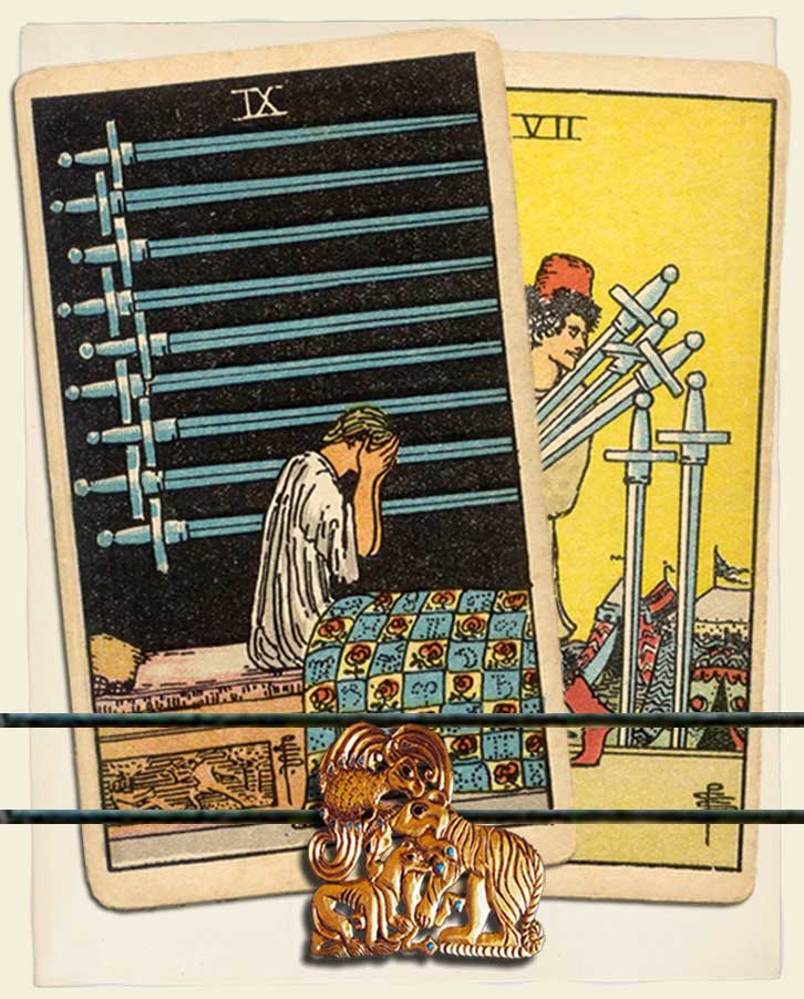 Nine of swords and Seven of swords tarot combination is an omen that two tarot influences: 1) Despair and 2) Strategy govern your life decisions today. What’s the advice of this pair? The Nine of swords represents deep emotional pain, often from a relationship gone wrong. This card indicates that you may be in a bad place mentally and emotionally. It can also indicate mental illness or even suicide thoughts. If so, seek help immediately. The Seven of swords is sometimes called the thief card and represents deception to someone who has put trust in someone else (a friend or family member). In this case, it seems as if people have been lying to you about something important, possibly about their intentions or feelings for you. You need to take steps to protect yourself from further harm.