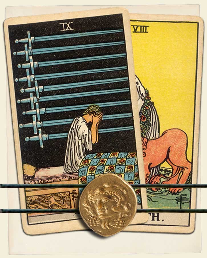 Nine of swords and Strength combination gives a hint about your near future, which is influenced by the arcane tarot forces of (A) Nightmares and (B) Influence. What does it mean in practice? You are under a lot of stress and may be sleeping poorly. The Nine of swords is sometimes called “the nightmare card,” and it speaks to being plagued by troubling or even disturbing thoughts. It can become an all-consuming energy that is difficult to get out of. Nines mark the beginnings of endings in the Tarot, though. So, it’s good news that the Strength card is here as well. The courage to overcome these obstacles is inside you, and you do have the fortitude to overcome this challenge. The key is a change in your state of mind. Focus on what you can control. The Strength card indicates that your power to influence the outcome is greater than the Nine of swords would have you believe.
