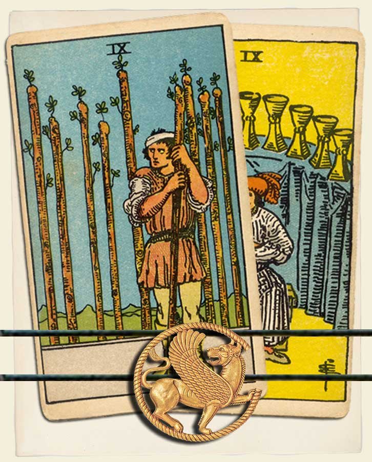 Nine of wands and Nine of cups combination is a sign that mystic tarot forces: A) Resilience (Nine of wands) and B) Satisfaction (Nine of cups) are steering you into another direction today. Nine of wands and Nine of cups combination is a sign that mystic tarot forces: A) Resilience (Nine of wands) and B) Satisfaction (Nine of cups) are steering you into another direction today as the reward for all your hard work comes to fruition, but it may also bring with it some new responsibilities. You have reached the top now, so don’t let this opportunity slip through your fingers. Take stock. Are you ready? If not, then maybe it is time to consider what would need to change in order for you to be more comfortable accepting these new circumstances? This could help prepare you if they do come along at a later date when you feel more prepared.