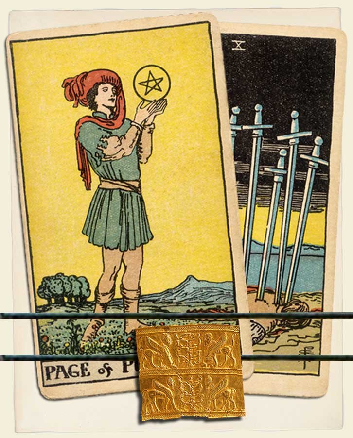 Oh, my dear. The Page of Pentacles and the Ten of Swords together? That’s not good news for love and relationships. The Ten of Swords brings with it bitterness and a grudge that’s keeping you chained to the past. You’re manifesting negativity towards someone else instead of focusing on your own positive future. But darling, remember that living well is the best revenge.