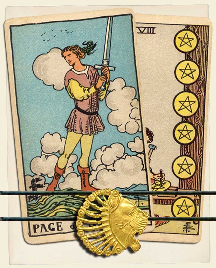 Page of swords and Eight of pentacles combination means that two tarot influences: 1) New Ideas and 2) Apprenticeship govern your life decisions today. Most tarot readers would consider this as a sign to learn a new craft. You have an idea that you want to express but feel that you don’t have the necessary skills to do it justice. Take purposeful action today towards seeking lessons which will equip you with the new skill that you find yourself gravitating towards. Set aside some time on a regular basis to prioritize mastering this new craft, and you will be rewarded with the blossoming of a new talent. This will allow you to honor your ideas by expressing them skillfully.