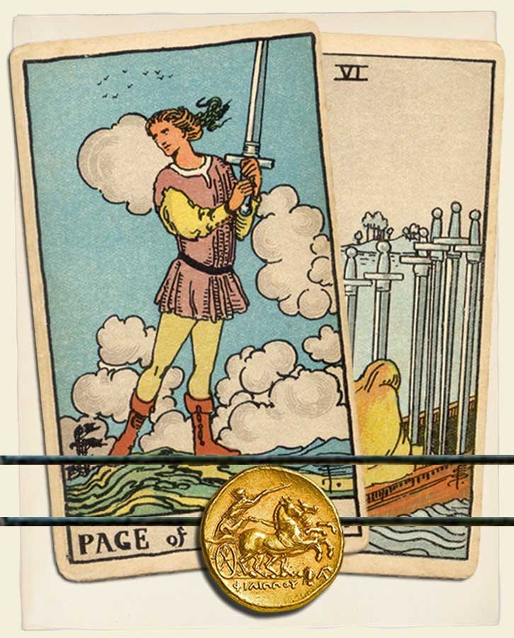 Page of swords and Six of swords combination indicates that mystic tarot forces: 1) Curiosity and 2) Escape govern your life decisions today. What’s the advice of this pair? The Page of swords represents a fast-moving, forward thinking energy that will cut to the chase. This card is urging you to be more direct in getting what you want out of life. The Six of Swords represents withdrawing from the world to rest and rejuvenate after an exhausting day. It can also represent sleepwalking through life without much thought or care for consequences. This card urges you not to fall into numbness, but rather use your curiosity about how things work (and don’t work) around you as a springboard for action.