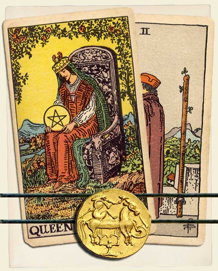 The Queen of pentacles represents a hardworking, nurturing energy that often signifies a parent figure. She is practical and can balance multiple responsibilities successfully. The Two of wands indicates the need to make a decision and emphasizes strategic planning.
