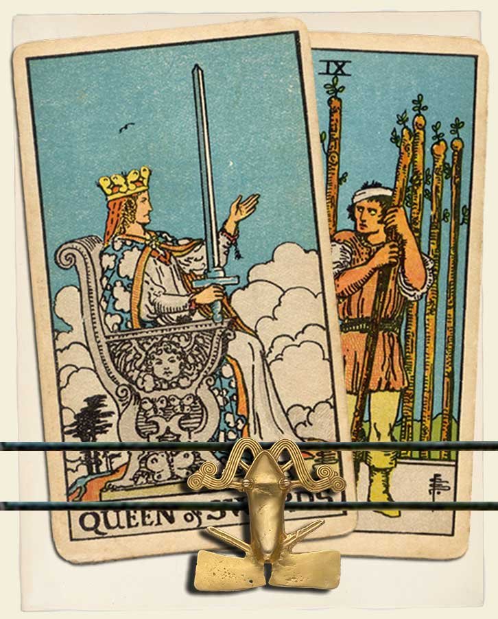Queen of swords and Nine of wands combination means that two arcane forces: 1) Constructive Criticism and 2) Boundaries guide your life decisions today. You may be receiving a lot of feedback right now, but it is not all good news. The Queen of Swords can be a very direct person who doesn’t suffer fools gladly, so take the time to listen carefully before you speak up. If you have something constructive to say about someone or some situation, do so in a manner that won’t cause any harm. Otherwise, keep your thoughts to yourself for now.
