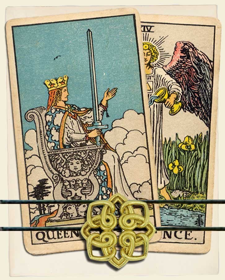 Queen of swords and Temperance combination gives a hint about an event in your future, which will arise from the combined effect of: (I) DIRECT COMMUNICATION (effect of Queen of swords) and (II) TRANQUILLITY (effect of Temperance). What does it mean in practice? Basically, you are being called to express yourself honestly and clearly in order to find balance and peace in the future. The Queen of Swords represents wisdom & maturity, she stands in her power and is not afraid to express herself. Channel this energy to reach the balanced tranquility of Temperance coming through in this reading.