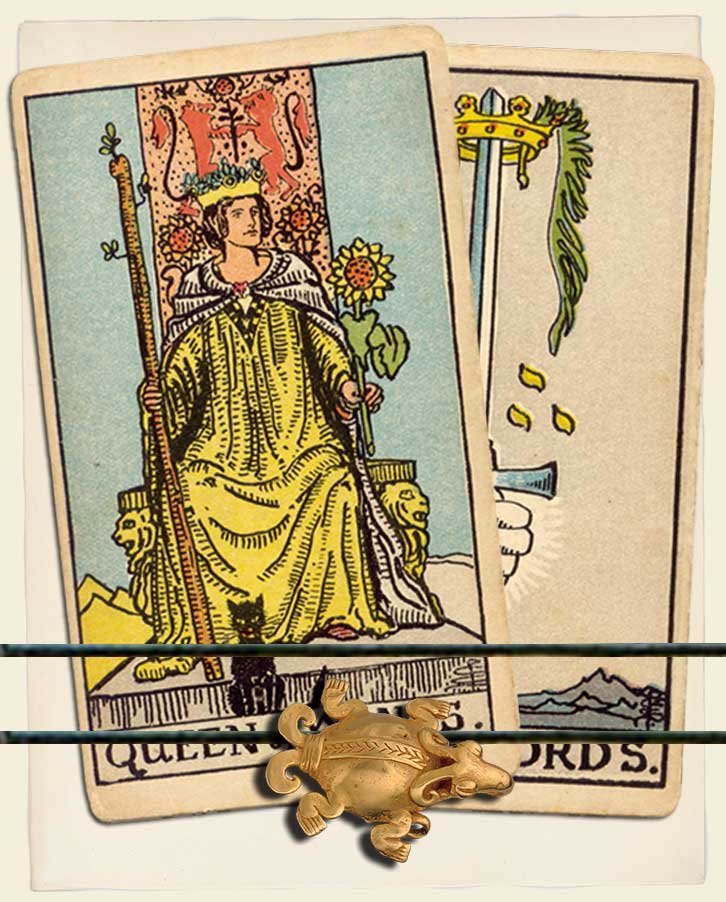Queen of wands and Ace of swords combination means that tarot influences: (1) Determination and (2) Success (influence of Ace of swords) are altering your life path at this reading. You have worked hard to get here, and you will not let anything or anyone take it all away from you now. It is time to celebrate your success, so don’t wait for others to notice your achievements. If they haven’t noticed yet, they will soon enough because the Queen of Wands knows how to command attention with her words as well as her actions. So make a speech or sing a song if you can do either one justice—or both.