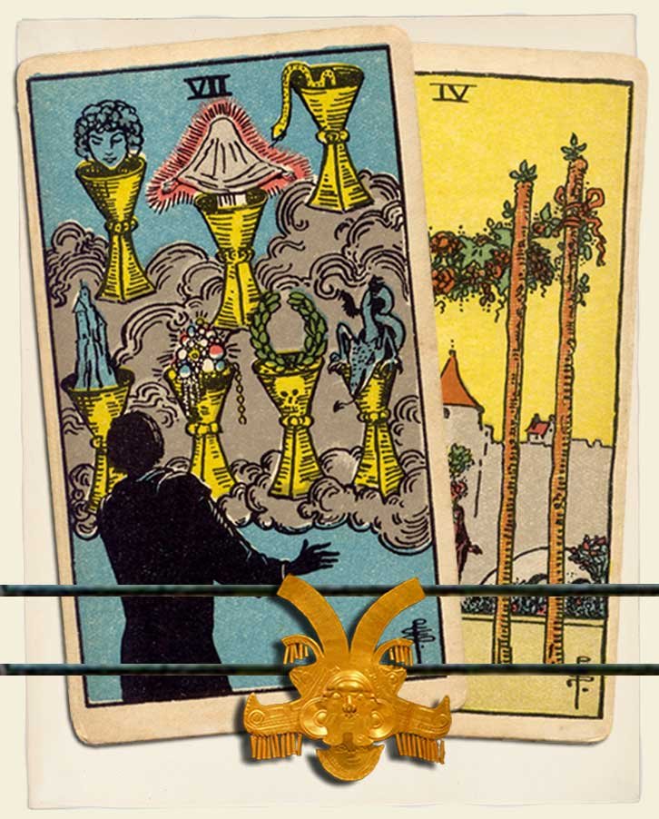 Seven of cups and Four of wands tarot combination means that two forces: 1) Wishful Thinking and 2) Celebration are exerting their influence on your life’s choices. You have been waiting for this moment, so you can celebrate with friends or family, but it is not quite ready yet. There is still something left to do before the party can begin, but don’t worry. It will happen soon enough because the Seven of Cups indicates that there is a lot going on in your life right now. The good news is that you have plenty to be happy about as well as some things you would like to change if only circumstances were different. Don’t dwell too much on what isn’t happening yet, enjoy yourself.