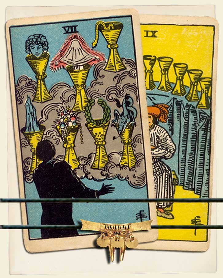 Seven of cups and Nine of cups combination is a sign that arcane tarot forces: 1) Choices and 2) Contentment are affecting you in this card reading. With the seven and nine of cups, this combination tells us that you may have too many options to decide from. This period might have left you puzzled and lost. However, Tarot assures you that in the end, you will be able to make the right choice. Leave your worries behind and listen to your heart, it will guide you to your truth.