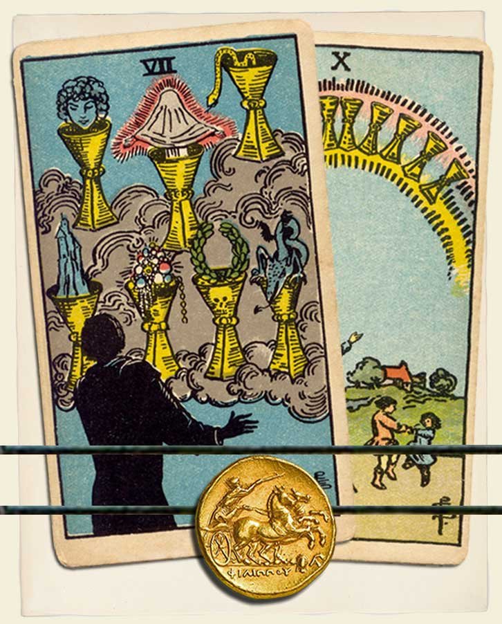 So there you have it folks: Seven of cups may bring disappointment but keep those options open, while Ten of cups promises true harmony in matters of amour! Now if you’ll excuse me, I have a date with my own soulmate at Café Carlyle. Ta-ta!
