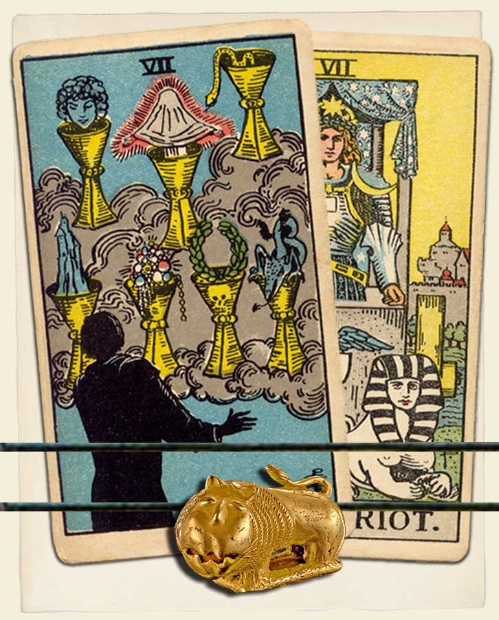 Seven of cups and The Chariot combination means that two forces: 1) FANTASY and 2) SUCCESS have influence on you at this moment. You are in the right frame of mind to take a chance on something new, but be careful. There is a risk involved with the Seven of Cups. It can lead to flights of fancy or even delusions if you’re not careful. Don’t let yourself get carried away with your imagination, but do allow yourself some fun now that you have achieved success because it has brought you into contact with The Chariot card which indicates victory through hard work (and sometimes sacrifice).
