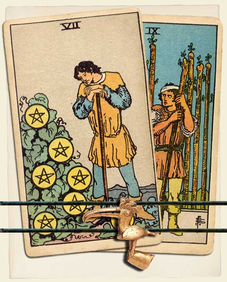 Seven of pentacles and Nine of wands combination means that arcane tarot forces: 1) Rewards (from the side of Seven of pentacles) and 2) Persistence (from the side of Nine of wands) have influence on you at this moment. What’s the advice of this pair? The Seven of pentacles is the card of the harvest and indicates that you are waiting for seeds you planted to bear fruit. The Nine of wands indicates that you may be frustrated in your wait. The Nine of wands is also an energy of exhaustion. It’s hard to go on, but persistence is required. Both these cards urge patience and holding on and waiting for the reward you worked so hard for.