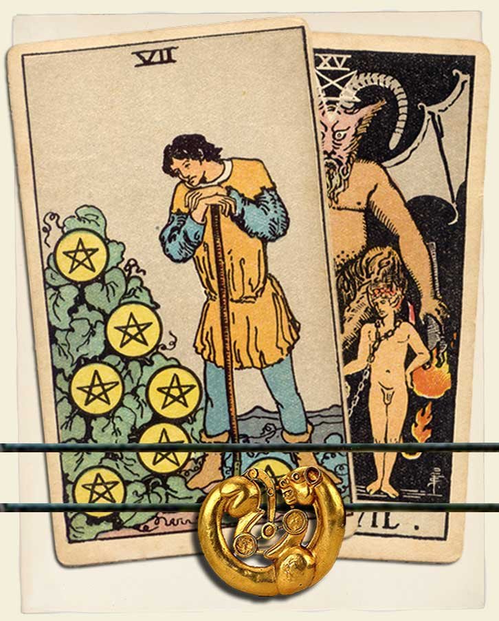 Seven of pentacles and The Devil combination means that two mystic forces: A) INVESTMENT (Seven of pentacles) and B) ADDICTION (The Devil) are influencing you at the moment. To put it differently, it indicates you may be obsessing over the end goal or attainment of a manifestation, but may not necessarily be putting in the necessary work to reach your goal. The Seven of Pentacles represents hard work, planning, and the strategic investment of time and energy. However, paired with the Devil, the meaning is changed, as it brings an energy of obsession in the outcome, and not putting focus on the steps that must be taken to reach the finish line. You are being asked to take a more balanced, strategic approach in the way you allocate your energies towards achieving your goals.