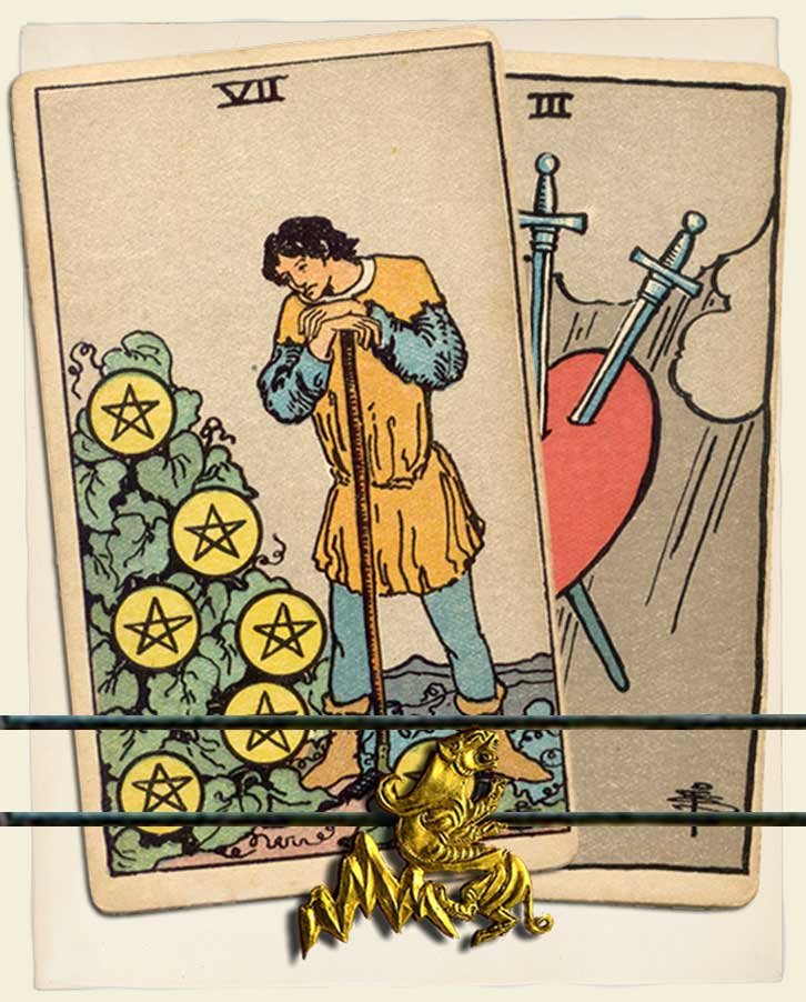 Well, well, well. It looks like we have a bit of a mixed bag here with the Seven of pentacles and Three of swords combination for love and relationships. Let’s break it down.