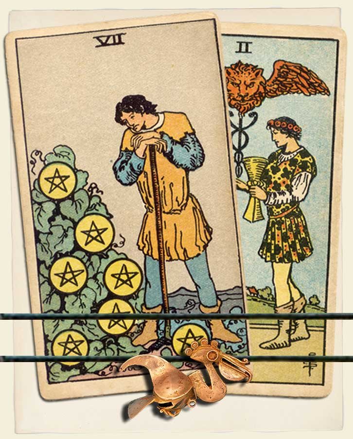Seven of pentacles and Two of cups combination indicates that two tarot influences: 1) LONG-TERM VIEW and 2) UNITY govern your life decisions today. In essence, here is what we wager to celebrate that lover, business partner, or bestie. In the seven, we have gathered together the fruits of all we have done in the past, and here, it meets the Two of Cups, which symbolizes relationships we are building in the present. You are in control. All depends on how you look at it. Do you fear loss, or do you value current relationships enough to take that risk on potential future gains? Think carefully. Anything is possible.