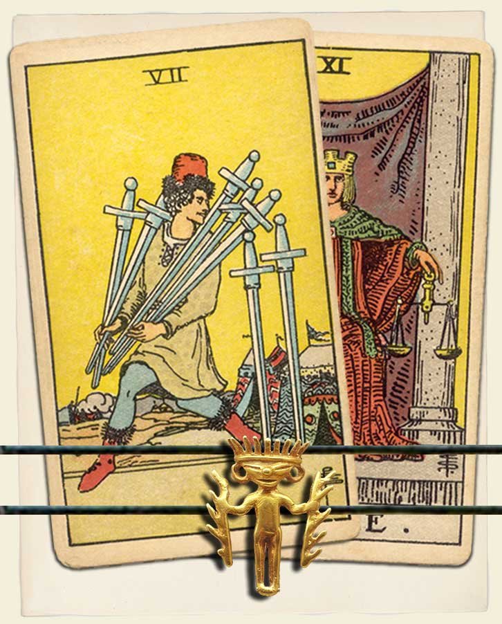 Seven of swords and Justice combination means that tarot influences: 1) Deception and 2) Justice have influence on you at this moment. What’s the advice of this pair? The Seven of Swords represents deception, often by someone in a position of power. This card indicates that there is something unfair going on around you. The presence of the Justice card indicates that whatever wrong-doing has taken place will be addressed fairly. In order for this to happen, it seems as if some people involved need to own up to their actions and take responsibility for them. If not, they may face further consequences down the road.