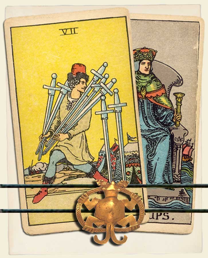 Seven of swords clarified by King of cups gives a hint about an outcome in your future, which is influenced by the arcane forces of ACTING STRATEGICALLY and COUNSELLOR. What’s the advice of this pair? The Seven of Swords represents high stress and mental exhaustion that can lead to sleepless nights. You may be under too much pressure or have too many people trying to take advantage of you. If so, it’s time for you to stand up for yourself and set clear boundaries with those around you. This requires tact, though, because if not done right, it will come across as coldness or even cruelty. The presence of the King of Cups indicates that someone close to you wants to help guide this process without making matters worse.