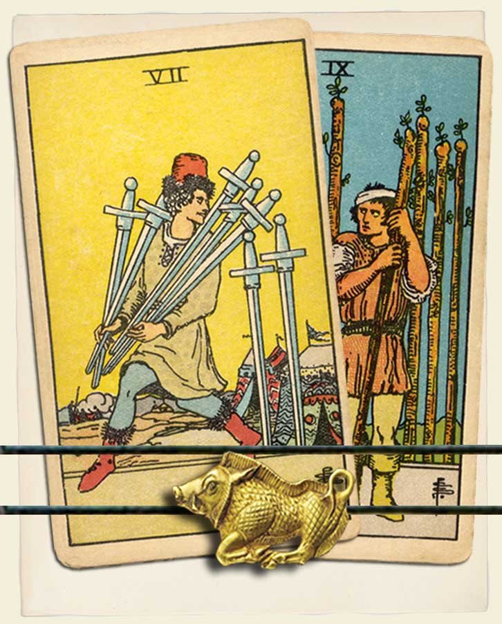 Well, let me tell you folks, the Seven of Swords and Nine of Wands combination is not a good sign for love and relationships. This here card combo tells us that we’re gonna be dealing with some trickery and persistence in our medium-term future. Now, I don’t know about y’all but when someone’s being tricky with me it don’t make for a happy relationship.