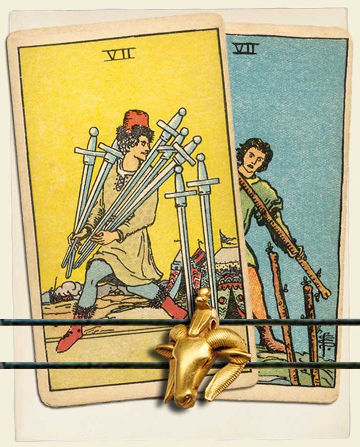 Seven of swords and Seven of wands combination gives a glimpse into your near future. It is influenced by the tarot forces of (I) RESOURCEFULNESS (from Seven of swords) and (II) PERSEVERANCE (from Seven of wands). You have been working hard on something, but it hasn‘t gone as well as you had hoped. Maybe you are facing obstacles or maybe there were problems with your assumptions, but whatever the case may be, this has caused some frustration for you. Don‘t give up now. Persevere because that is what this card means in combination with the Seven of Wands—perseverance through difficulty to achieve success.