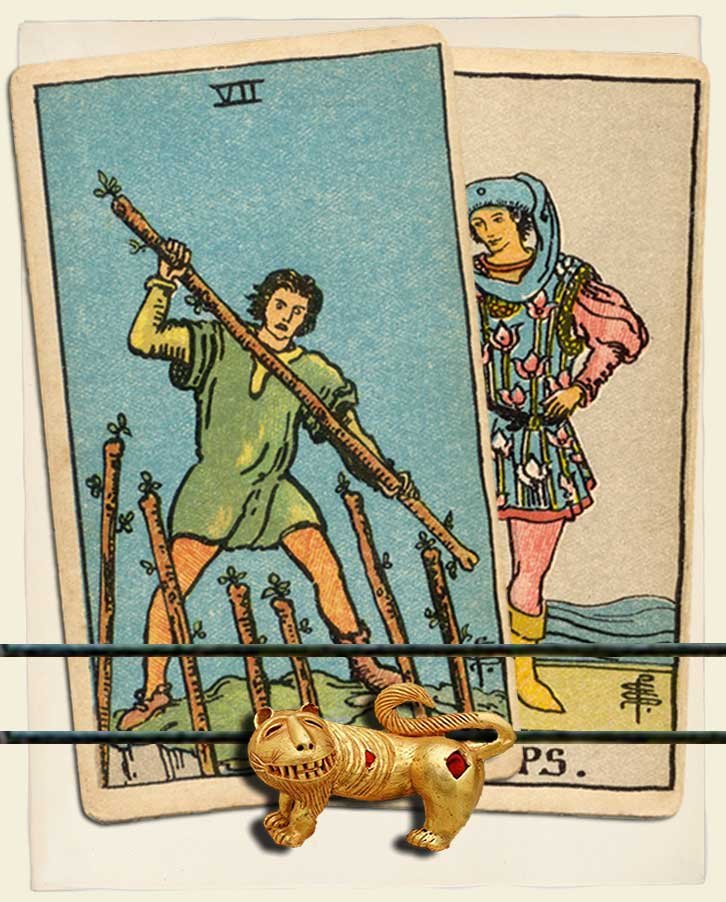 The Seven of Wands means perseverance but can also mean over-protectiveness which ain’t always good. It depends on whether both partners are workin’ towards the same thing or not. And if your partner triggers unhealthy behavior from you, that could be a problem too.