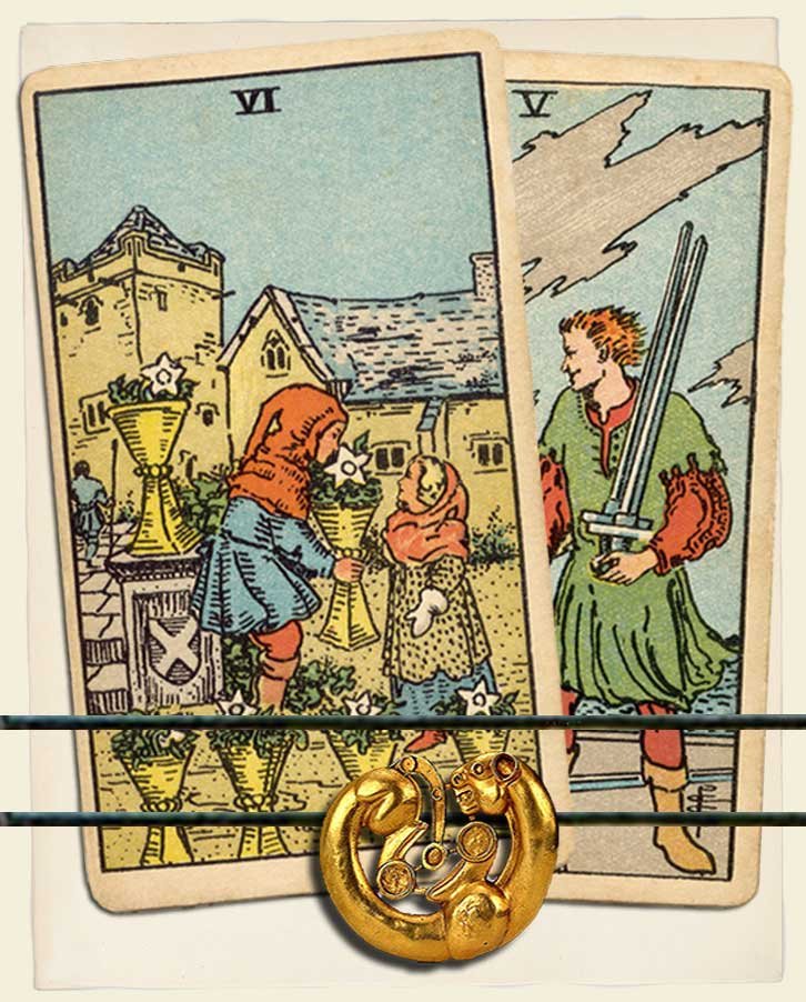 Six of cups and Five of swords combination means that two mystic forces: 1) Joy (from the side of Six of cups) and 2) Competition (from the side of Five of swords) drive your choices at this moment. What does it mean? It is time to celebrate, but you may find yourself in a position where others want to share in your joy. This could create some competition or even conflict, so be careful about how you express yourself. You don’t want to cause any hard feelings, but you also don’t want to hold back on expressing your own happiness because someone else might feel left out. Let them do their own celebrating too if they are unhappy with their situation as well.