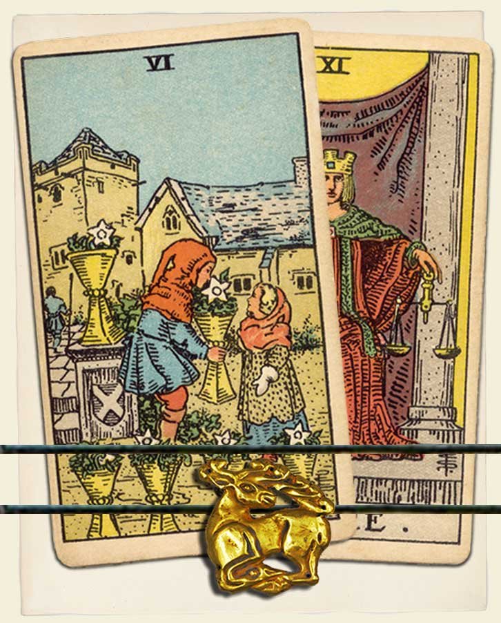 Six of cups clarified by Justice gives you an insight into a significant event in your future, which is directed by the guiding influences of (A) SENTIMENTALITY and (B) LAW (as clarified by Justice). Don’t be drawn into legalities that you have a personal opinion on. There may be laws you don’t like, but they are laws for a reason. So if you see a grey, murky line between your morals and what the state says should be applied in legal terms, it’s time to change it to a solid black line, and remain on the right side of it.