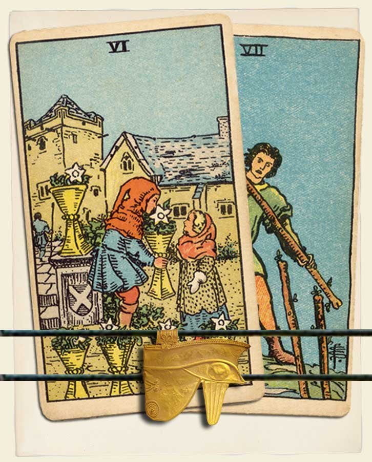 Six of cups and Seven of wands tarot combination is an omen that two tarot influences: 1) Childhood Memories (from the side of Six of cups) and 2) Perseverance (from the side of Seven of wands) together are exerting influence on you. In other words, it means the dreams you have been having about your late grandparents have a message for you to heed. You have been thinking of them often, and their message to you concerns the ties you have to your family. Reconcile with that family member you have been at odds with. It is time for the two of you to make peace, and both your lives will be better.