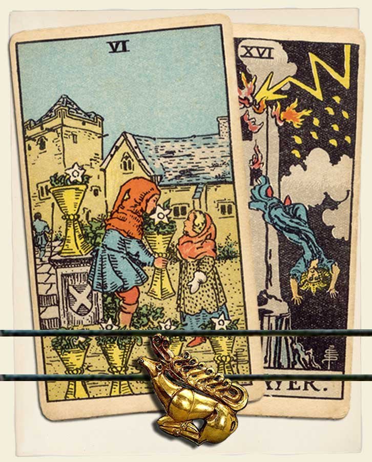 Six of cups and The Tower combination means that two arcane forces: (1) Memories and (2) Trauma currently guide your decisions. In a nutshell your past is haunting you at this current moment in time. While you’ve been running the pain, it has come to face you, potentially revealing parts of the past you had blocked altogether. Do not fear that which you are discovering from these memories. Acknowledge the strength you still maintain despite your past, and allow it to propel you into a meaningful future.