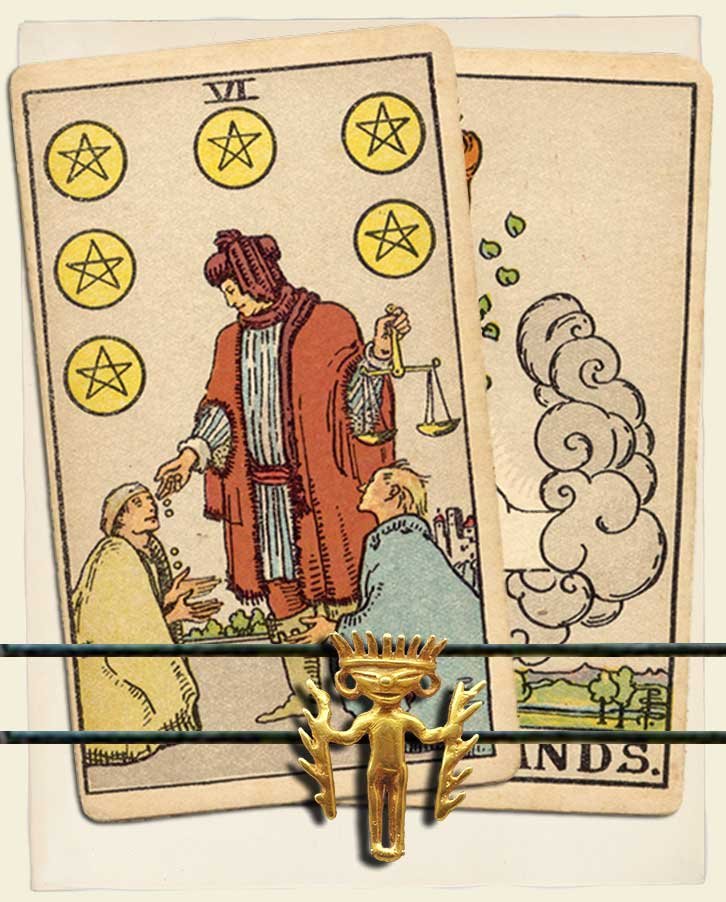 Six of pentacles and Ace of wands combination indicates that two forces: 1) COMMUNITY and 2) NEW PASSION have influence on you today. What does this card combination mean for you in practice? This is the perfect moment to dedicate time to nurturing a new project. Believe in your potential, dedication to your ideas will make new passion flourish from a tiny bud into a beautiful flower. Do not let self-doubt distract you from the task in hand. Trust passion to motivate and guide you. As the project blossoms from your hard work and commitment, others will join on your journey, and their lives will benefit too.