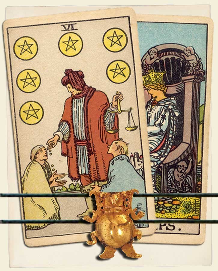 Six of pentacles and Queen of cups combination gives you a better insight into a significant event in your future. It will come to pass from the combined effect of (1) MATERIAL HELP (effect of Six of pentacles) and (2) WARMTH (effect of Queen of cups). What does it mean in practice? Well, in practice, the Queen of Cups is usually only ever good for falling in love or a shoulder to cry on, but when you find her with the Six of Pentacles, she may have more than her usual entertainment value to offer. Here, the Six of Pentacles lends this queen a more practical air of sophistication. She may have good advice for you or her usual inclination to have sympathy will drive her to loan you the money for this month’s car payment. You should listen. This opportunity doesn’t come along every day.