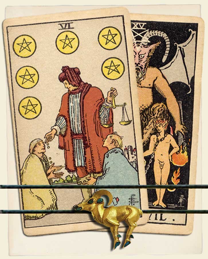 The Six of pentacles and The Devil combination in love and relationships is a complex one. The guiding influences of charity and dependency are evident, as well as materialism and generosity playing significant roles. There may be a sense of playfulness, but also dependency.