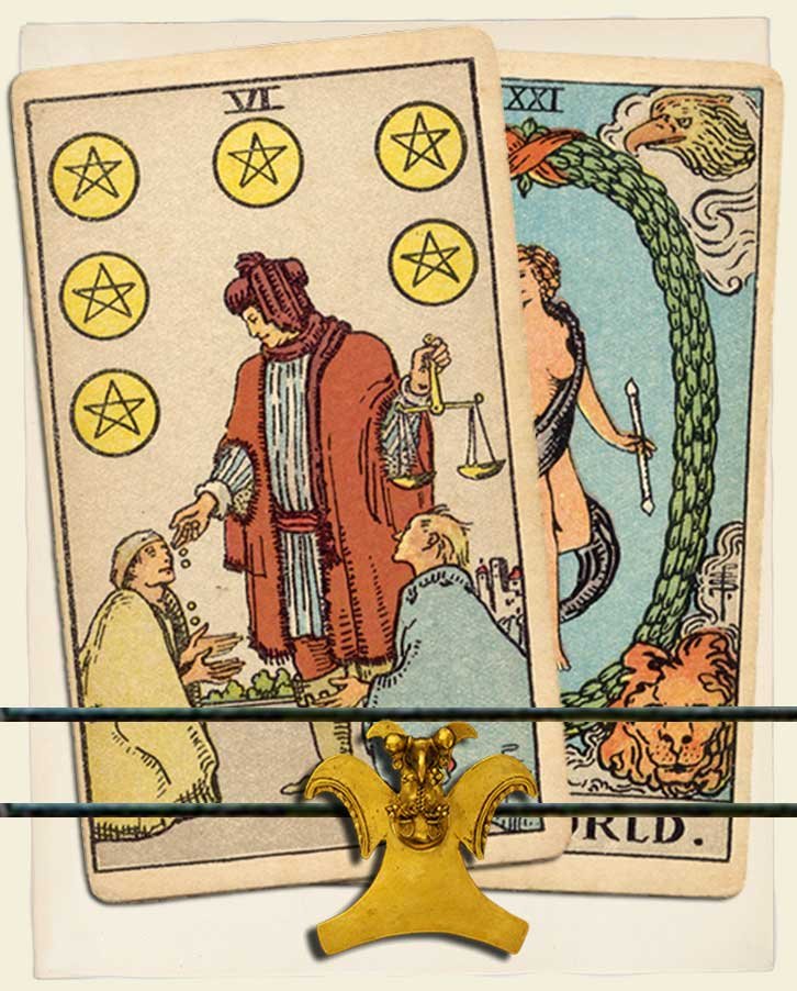 Six of pentacles and The World together indicates that two forces: 1) Community and 2) Completion govern your life decisions today. What’s the advice of this pair? You are in a position to help others, but you need to be careful not to get too wrapped up in yourself. The Six of pentacles is sometimes called the thief card because it represents someone who takes advantage without regard for others. This can create an energy of selfishness that leads people into taking advantage even more egregiously than they might otherwise have done. Be sure you’re setting an example by valuing relationships over self-interest, so no one feels as if they have to take advantage either.