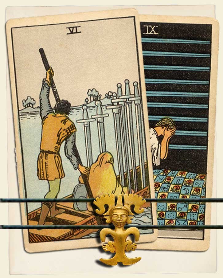 Six of swords and Nine of swords combination provides an insight into your actual state and close future, which will come to pass from the combined effect of (1) ACCEPTING LESSONS (effect of Six of swords) and (2) NIGHTMARES (effect of Nine of swords). To put it differently, it indicates that it may be time to stop fearing your future. You have been kept awake lately, deep into the night. You are missing many hours of sleep, but if you heed the advice of a family member, you will be instantly able to resolve the anxiety and will again be able to sleep.