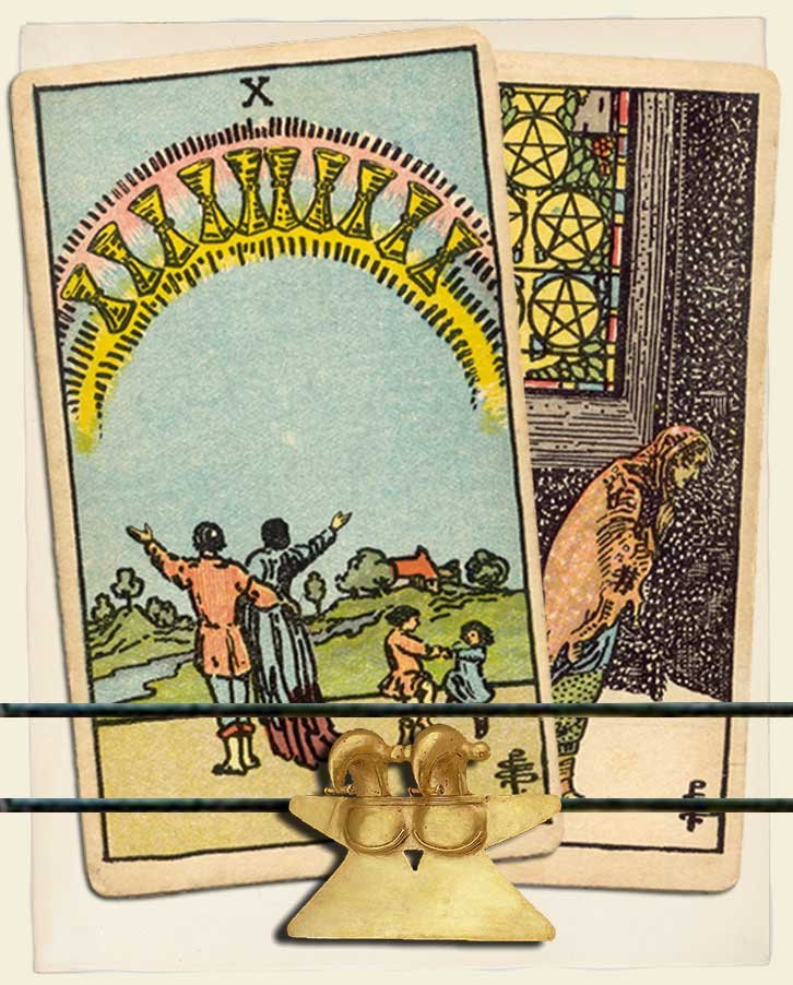 Ten of cups and Five of pentacles combination means that two tarot influences: 1) Emotional Stability and 2) Financial Loss govern your life decisions today and you don‘t need to waste too much of your energy on a recent financial loss. There are better things for you to think about with the Ten of Cups nearby. You have more than one solid relationship in your life right now, and you can count on that to see you through your troubles. Whatever these problems are, there is support now. They may help with the problem or maybe just provide you with the loving moral support you need. Relax. This is going to work out.