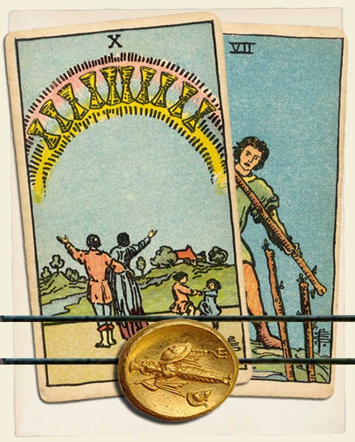 Ten of cups and Seven of wands combination indicates that two arcane momenta: 1) Homecomings and 2) Standing Up For Yourself govern your life decisions today. This pair appears when someone needs to push through to reach their inner peace and happiness. Once this is attained the party will be able to work towards making dreams come true. Some sort of defense mechanism will need to be used during this time as well if this combination appears.