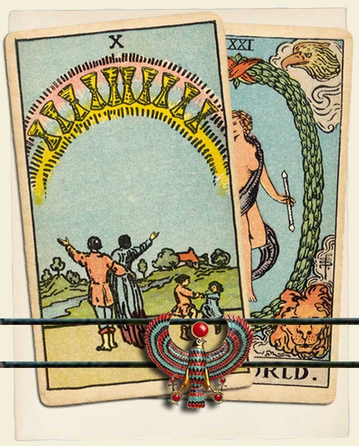 Ten of cups and The World tarot combination gives you an insight into a major event in your future, which will come to pass from the combined effect of (1) HARMONY (effect of Ten of cups) and (2) INTEGRATION (effect of The World). In summary, it gives us a clue about the outcome of your relationship. You are in perfect harmony with your partner. It’s as if you don’t realize how time flies by in his company. Soon he will tell his family about you and an introduction will take place. You don’t have to worry because they will think that you are made for him.