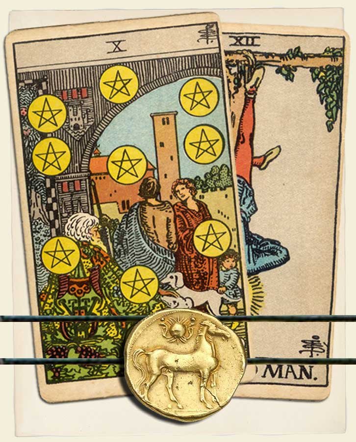 Ten of pentacles and The Hanged Man together means that two mystic forces: 1) Roots and 2) Contemplation are exerting their influence on your life’s choices. It is time to consider the foundations of what you have built, because it was built on solid ground. What’s the advice of this pair? You may be in a position where you feel as if you need to take stock and evaluate some important aspects of your life. This can often lead to feelings of guilt or shame, which are indicated by the Hanged Man card. If so, don’t dwell there too long. The Ten of pentacles indicates that whatever decisions you make will create stable foundations for future growth (even if they won’t grow immediately). Make sure those decisions reflect who you want to be and not just how much money or power you think you deserve.