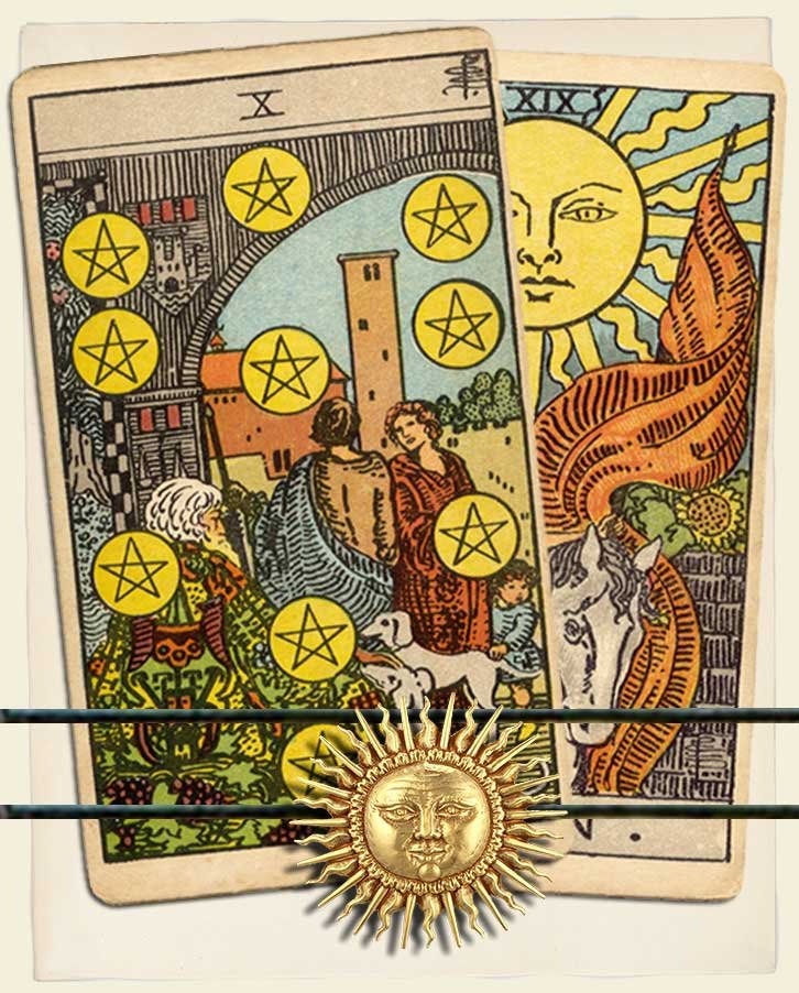 Ten of pentacles and The Sun tarot combination gives an insight into your distant and barely discernible future, which is influenced by the tarot forces of (I) ROOTS (from Ten of pentacles) and (II) OPTIMISM. In other words, it means that you have created the circumstances in which you can find long-term success. What’s the advice of this pair? The Ten of pentacles describes “having it all” – wealth, stability, family, etc. You’re well on your way to reaching this destination because of where your journey began. You planted the right seeds at the right time, and they’ve provided a firm foundation for you. You will also have multiple generations of family and friends in your corner. The Sun is a card of success. You have a lot to look forward to. If you’re feeling apprehensive, don’t. Lack of optimism and self-sabotage could derail this energy.