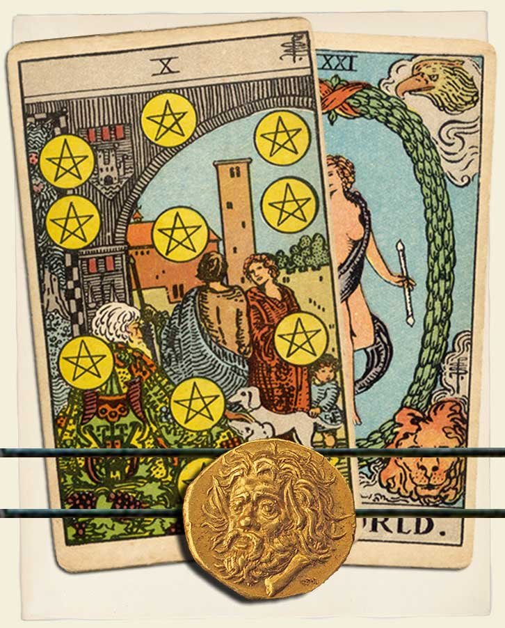 Ten of pentacles clarified by The World means that two forces: (1) Financial Security and (2) Travel guide your decisions today. You have been longing for a vacation, but this is not the time to spend money on anything except necessities. No matter how much your loved one desires some fun and frolic, do not cave in to their enticements. Let them know you will make your home as inviting as possible and give them some extra affection. They will show their appreciation once they see this is true.