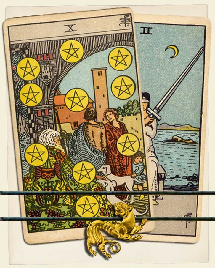 Ten of pentacles and Two of swords tarot combination indicates that arcane tarot forces: (1) Family and (2) Stuck In The Middle (influence of Two of swords) are influencing you at the moment. What’s the advice of this pair? The Ten of pentacles represents a situation in which there is an equal distribution between family members, who may have different ideas about how to handle it. This can create conflict or even feelings of being stuck in the middle. The Two of swords represents having your thoughts blocked by something unpleasant. It seems as if you’re trying to get away from a difficult situation but can’t because someone else has their hands on the wheel. You feel powerless, so perhaps it would be best for one person to take control and make decisions for everyone involved.