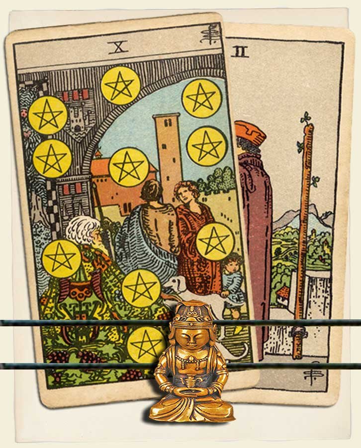 Ten of pentacles and Two of wands combination gives a glimpse into your distant and barely discernible future. It is directed by the guiding influences of (A) Legacy and (B) Leaving Comfort. What’s the advice of this pair? The Ten of pentacles represents having everything you need to start a stable new life after a period of taking care of all your obligations in one way or another. You have left some things behind, but not everything, because there are still items that will remain with you as part’s-of-yourself for the foreseeable future. This indicates that you may be leaving something behind that has become comfortable for you. The Two of wands indicates that it might be difficult to leave this situation behind completely without feeling like an exile from home. If so, take heart in knowing that wherever you go next, at least it won’t feel quite so empty.