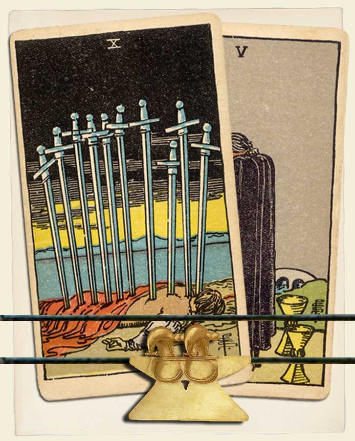 Ten of swords and Five of cups combination means that two tarot influences: 1) Failure and 2) Sadness are influencing you at the moment. Walking around with your tail between your legs will only emphasize your sense of despair. Despite a recent event that you view as a failure, you must recognize that you as an individual are not a failure. We must empty our cups in order to fill them up. Dump out the sadness, and with a clean slate begin to fill your cup up again through hard-work, self-love and passion for your goals.