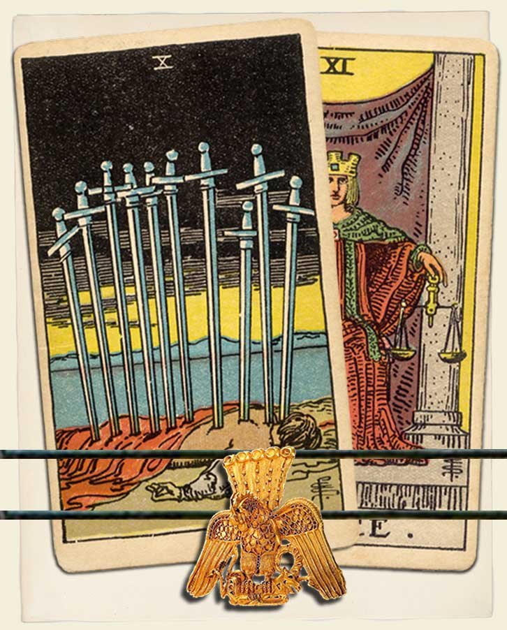 Ten of swords and Justice combination is an omen that two mystic forces: (1) Ruin and (2) Accountability guide your life decisions today. What’s the advice of this pair? The Ten of Swords represents a high degree of mental anguish brought on by a painful betrayal. This card indicates that you are in serious emotional pain, as indicated by the presence of the King of cups – someone who can heal emotional wounds. However, this energy isn’t healing properly because there is also another force at work: sabotage or dishonesty. Someone has been pulling the wool over your eyes, so to speak, keeping you from getting what you deserve from those around you. It may be time for some hard truths to be told about their actions towards you.