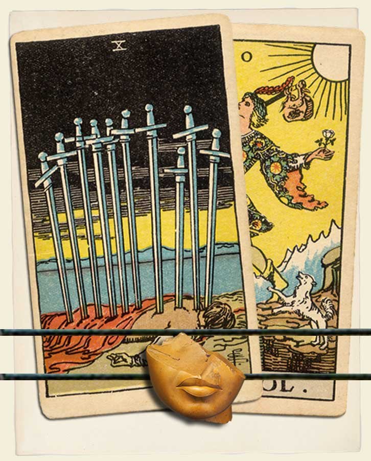 Ten of swords and The Fool combination indicates that two tarot influences: 1) Deep Wounds (influence of Ten of swords) and 2) Beginnings (influence of The Fool) are jointly affecting you today. In other words, it means you have the unique power of shifting something of pain into a new beginning of clarity and freshness. This is a gift, and you are a conduit of beauty in the world at this time. Enter your fresh start with optimism, leaving the past as a mere scar, but not a defining quality of yourself. Your wounds will heal with time if you dedicate yourself to a higher life of a meaning.